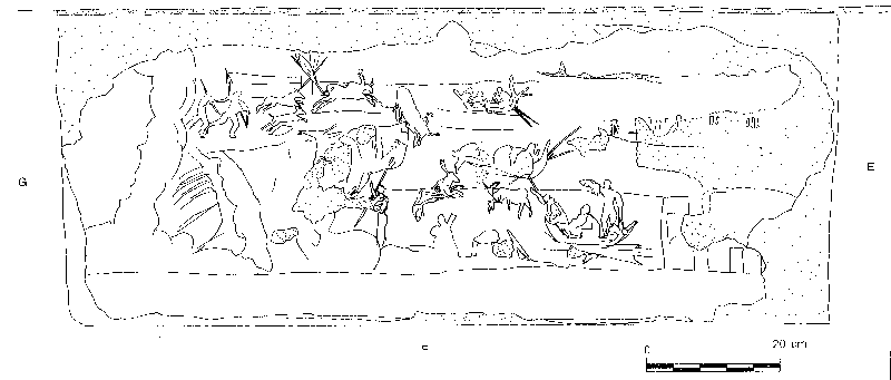 À noter qu’une inscription donne le nom de la maison « NYMPHARVM DOMVS », la maison des Nymphes, dont Jean-Pierre Darmon, celui qui l’a découverte, avait fait remarquer que c’est le terme employé par Énée lorsqu’il aborde justement le rivage de ce qui deviendra Carthage, juste avant la chasse mémorable aux cerfs relatée par Virgile et illustrée par cette peinture (fig.1) dont le relevé graphique permet de restituer toute la scène (fig. 3). Nous n’en connaissons pas d’autre exemple. »