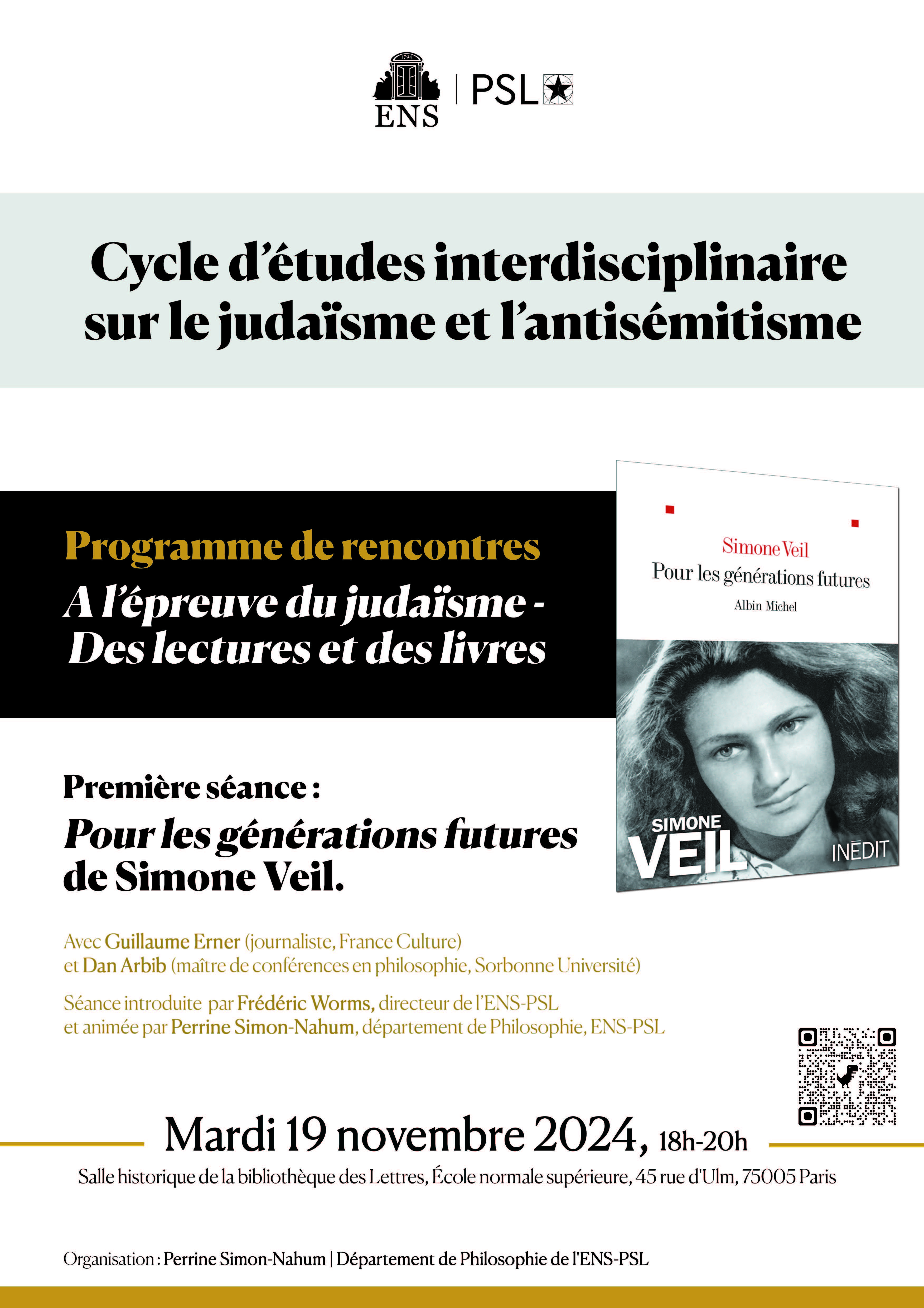 En 2005, Simone Veil prononce une conférence devant les élèves de l’ENS sur la mémoire de la Shoah et sa transmission aux nouvelles générations, le sort des enfants cachés, la réconciliation et l’unité européenne, le rôle de la fiction et de la jeunesse pour ne jamais oublier les tragédies du passé. Son texte – jusqu’ici inédit – vient d’être publié (Albin Michel) et cette première séance propose une discussion à son sujet, animée par Perrine Simon-Nahum, avec Guillaume Erner (essayiste, journaliste, France Culture) et Dan Arbib (maître de conférences en philosophie, Sorbonne Université). Elle sera introduite par Frédéric Worms, directeur de l’ENS-PSL.