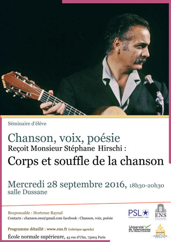 28 septembre 2016 : Salle Dussane. Introduction. Avec Stéphane Hirschi (université de Valenciennes). Corps et souffle de la chanson.