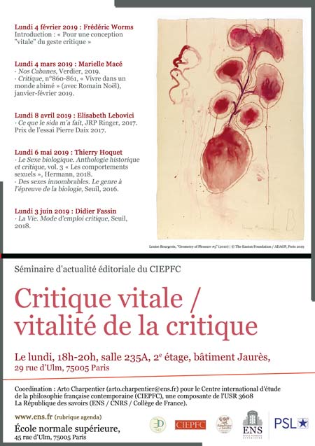 Nous comptons éprouver cette hypothèse au contact de parutions récentes qui croisent une réflexion sur le geste critique avec une attention aux enjeux propres au vivant, tels que la vulnérabilité des vies, l’expérience de la pathologie, le soin et la pratique médicale, l'articulation du biologique et du social ou encore l’écologie – que ces ouvrages relèvent de la philosophie proprement dite ou bien d’une démarche interdisciplinaire. Le but est ainsi d’esquisser un panorama des enjeux vitaux de la critique aujourd’hui.